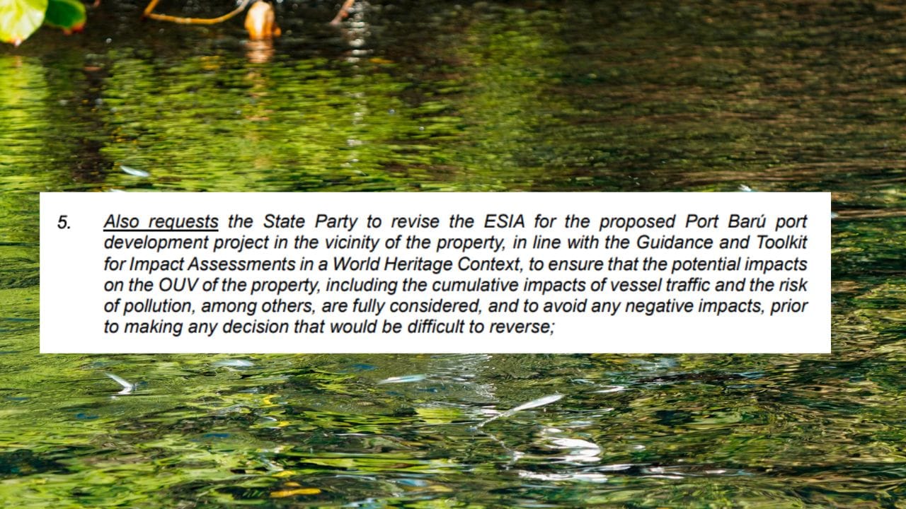 En su decisión oficial (ver página 138 y siguientes), la UNESCO pone en el centro una preocupación clave: los efectos indirectos del proyecto Puerto Barú en Chiriquí no han sido suficientemente evaluados.